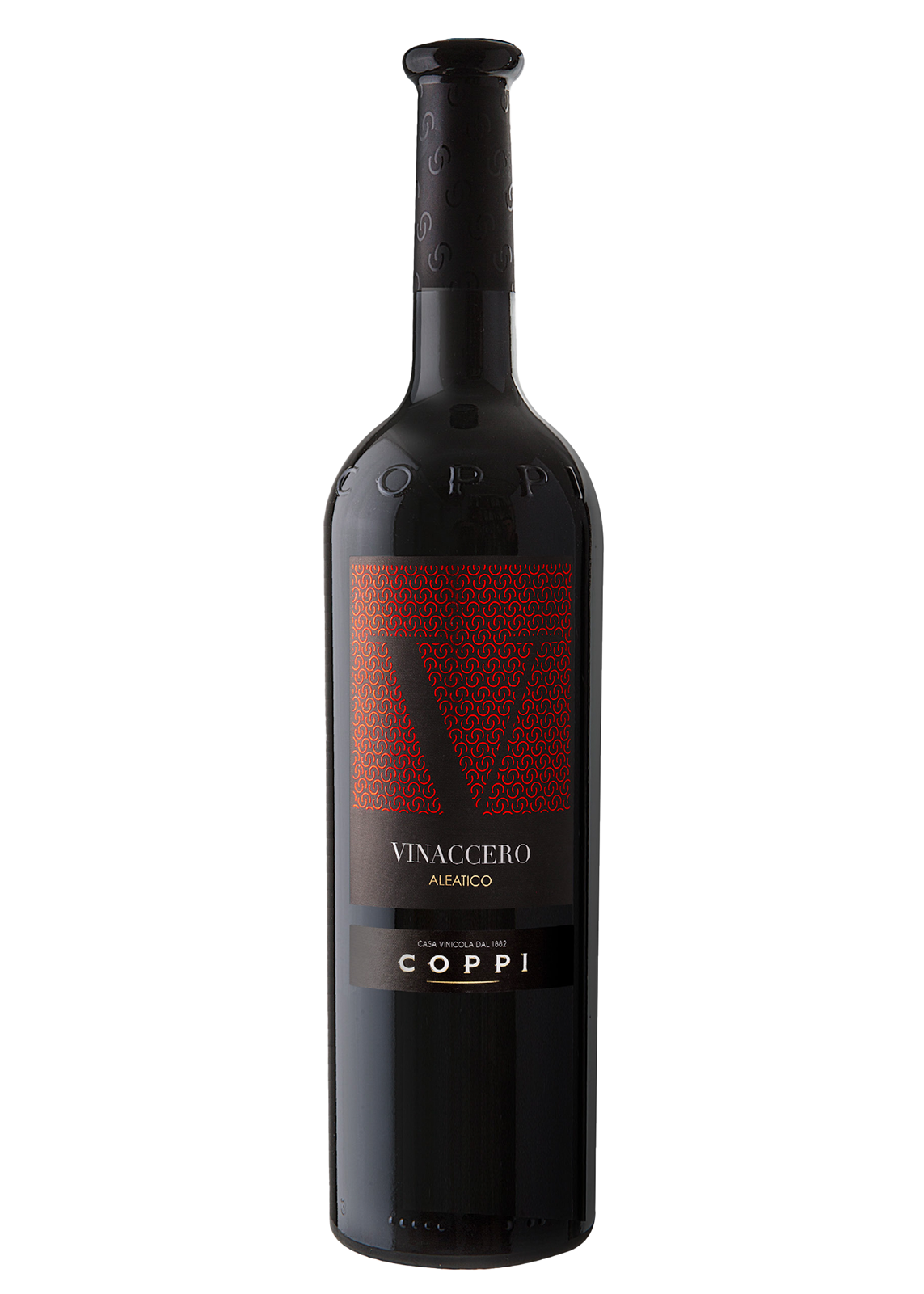 Ontdek Vinaccero Aleatico I.G.P. Puglia, een wijn gemaakt van 100% Aleatico-druiven uit contrada Marchione, Puglia. De grond in dit gebied bestaat uit steen en karst (waar kalksteen oplost onder invloed van atmosferisch koolzuur). De druivenstokken zijn geplant in de jaren '90 en de druiven worden geoogst in de tweede helft van september, na een droogperiode aan de druivenstokken.